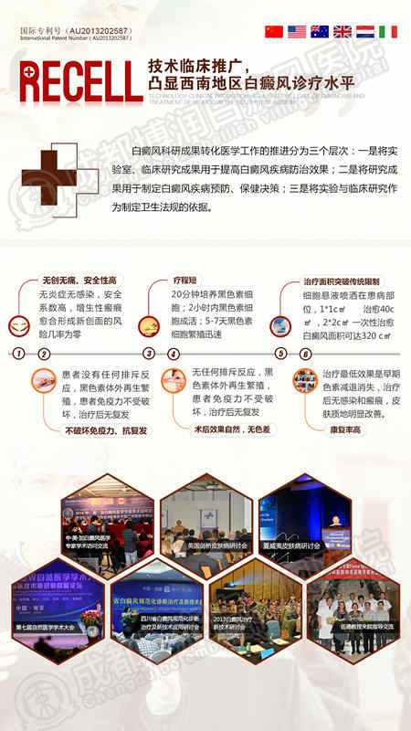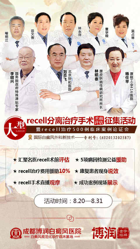 鉴于此,作为四川省白癜风规范化诊疗临床基地,专业白癜风医院金字招牌,为提升我省医疗机构白癜风病种的规范化诊断治疗标准和技术研发,我院决定开展白癜风外科诊疗新动向——大型Recell分离治疗手术术前评估征集活动 暨Recell治疗500例案例论证会,征集各类白癜风患者,为患者提供白斑检测援助,进行治疗手术评估,选择条件符合的患者进行Recell手术治疗,并援助10%手术费用,将Recell分离技术这一前沿技术成果普及给更多的患者。
