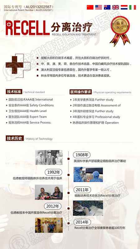 其中Recell细胞再生术目前国际唯一由中美英澳荷意六国联合认证,获得国际专利的一项技术。利用黑色素细胞内治与再生疗法,突破了传统表皮移植方法治疗面积受限、易复发感染等局限,攻克大面积白癜风医学壁垒,康复率达到98%!
