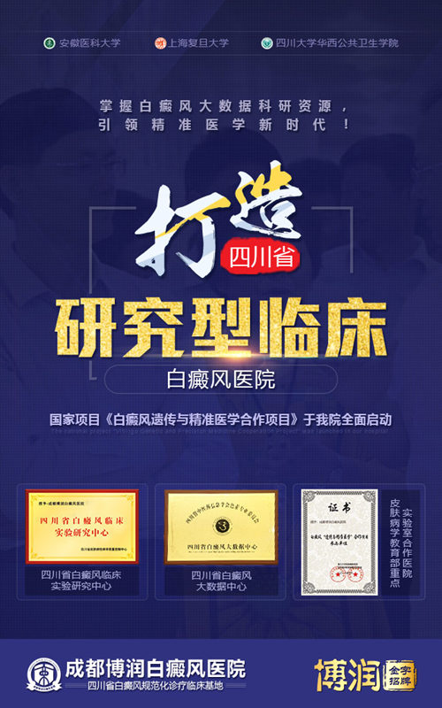 作为国际专业的白癜风诊疗机构,成都博润自建院以来,持续加大医学科研投入,引进国际研究型医师和临床科研人员,积极参与新技术研发,成功促进临床成果转化。先后与中美英加澳等国达成学术交流合作;受邀“第39届夏威夷皮肤病研讨会”、“第四届英国剑桥皮肤再生学术研讨会”、“世界中医药学会联合会第八届中医皮肤科国际学术大会”等学术峰会。尤其是四川省白癜风大数据中心和四川省白癜风临床实验研究中心的成功落成,我院建设起一支专业化、专职化的临床科研队伍,从中医、外科、光疗等各方面改良创新治疗技术,解决了白癜风治疗困境,真正打造出国际性、专家型、研究型的白癜风专业医院。